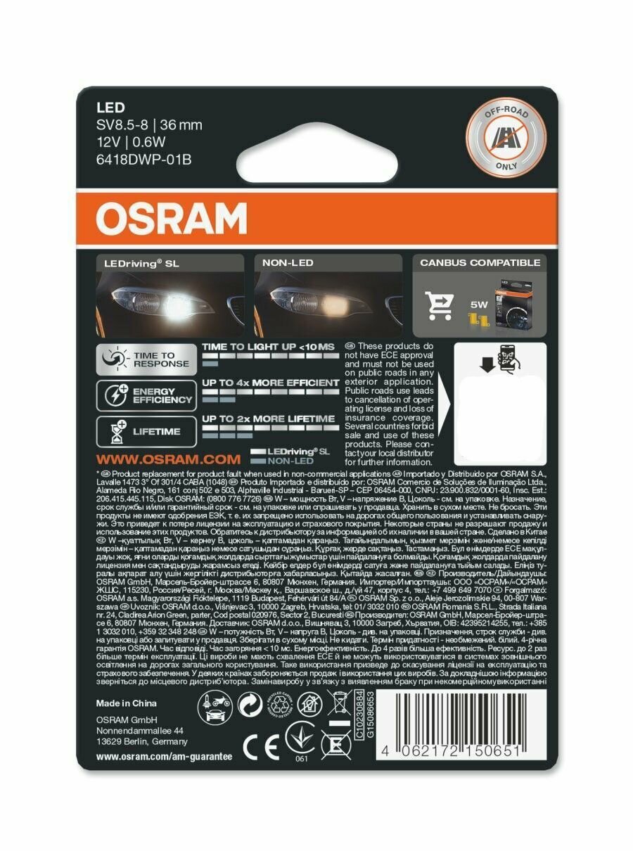 СохранитьЛампа подсветки светодиодная C5W 12V "OSRAM" (36 мм) OSRAM 6418DWP-01B | цена за 1 шт интересное: