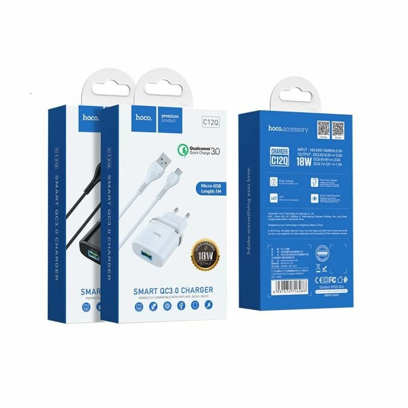 Сетевое ЗУ USB Hoco C12Q + кабель Micro USB (1USB/QC 3.0/18W) белый
