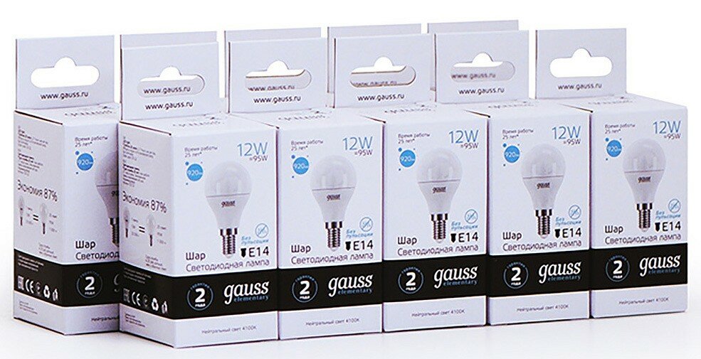 (5 шт)Лампа Gauss Elementary Шар 12W 920lm 4100K Е14 LED 1/10/100