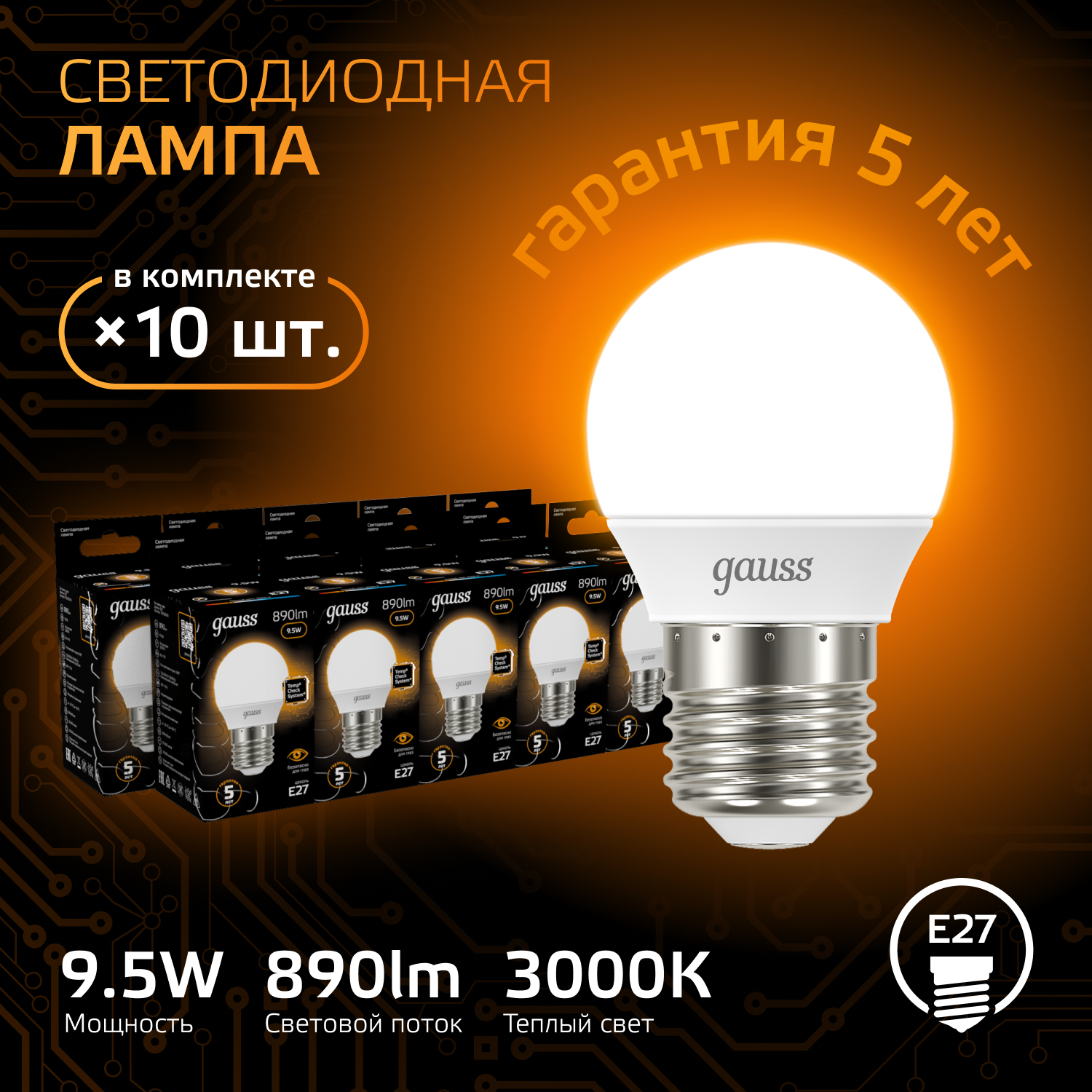 Лампочка светодиодная E27 Шар 9.5W теплый свет 3000K упаковка 10 шт. Gauss
