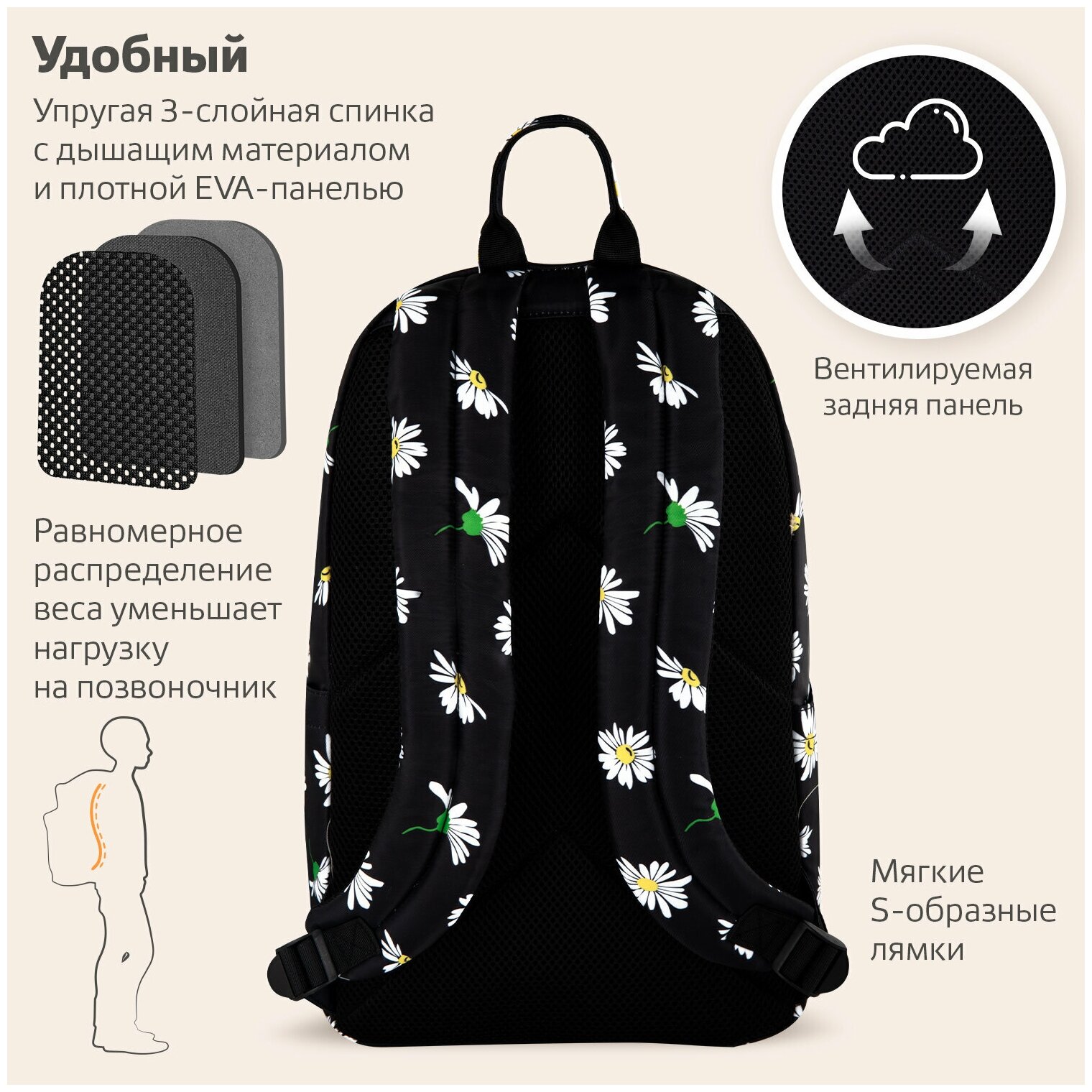 СохранитьРюкзак BRAUBERG DREAM универсальный с карманом для ноутбука, эргономичный, "Camomile", 42х26х14 см интересное: