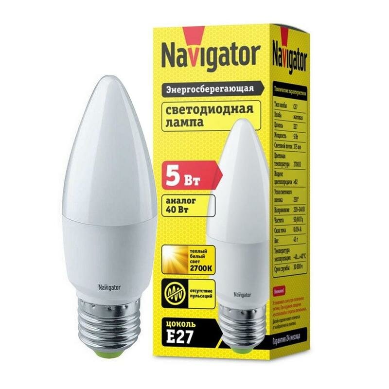 (5 шт.) Светодиодная лампочка Navigator C37 свеча, мощность 5Вт, напряжение питания 230В, цветовая температура 2700K, теплый белый свет, цоколь E27, размер 37х100 мм, NLL-P-C37-5-230-2.7K-E27-FR