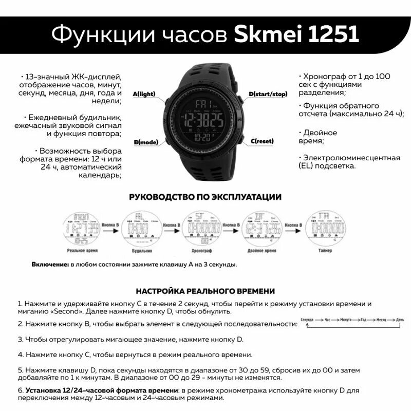 Часы наручные SKMEI 1251 черные, Спортивные, водонепроницаемые, электронные, будильник, подсветка, таймер, секундомер