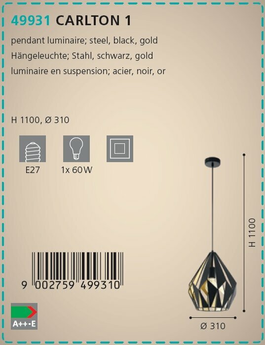 Eglo 49931 Подвес CARLTON 1, 1x60W (E27), 310, H1100, сталь, черный, золотой 49931