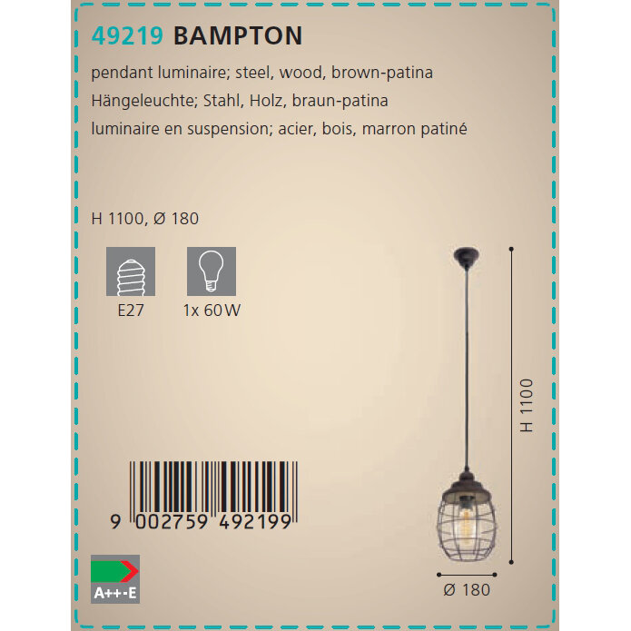 Светильник подвесной Eglo BAMPTON, 49219, 60W, E27