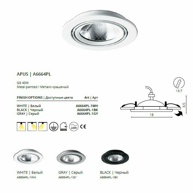 Встраиваемый светильник APUS, ARTE LAMP A6664PL1WH (1 шт.)