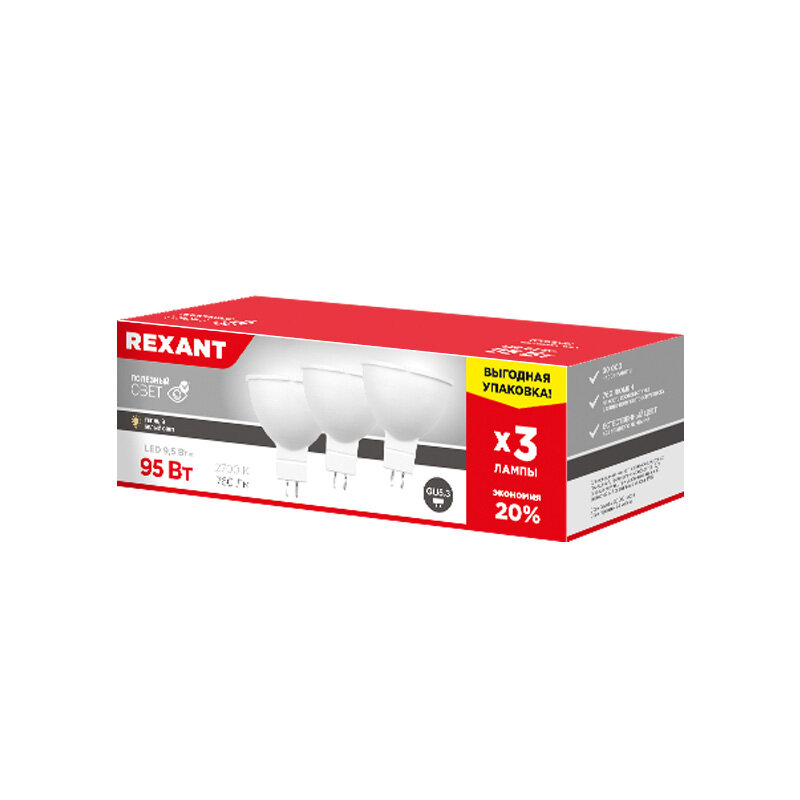 Светодиодная лампа Rexant GU5.3, 9.5 Вт, 760 Лм (=95 Вт), 2700 K (теплый свет), упаковка 3 шт.