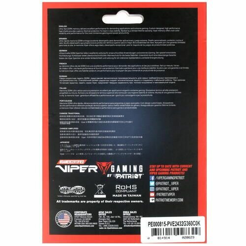 Ниже Вы можете прочитать отзывы на Оперативная память Patriot Memory VIPER ELITE II 32 ГБ (16 ГБ x 2) DDR4 3600 МГц DIMM CL20 PVE2432G360C0K, ознакомится с подробными характеристиками, посмотреть интересные обзоры и фотографии на Оперативная память Patriot Memory VIPER ELITE II 32 ГБ (16 ГБ x 2) DDR4 3600 МГц DIMM CL20 PVE2432G360C0K.