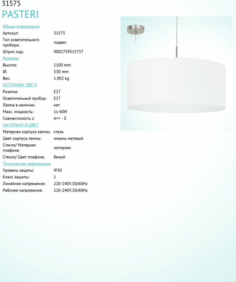 Ниже Вы можете прочитать отзывы на 31575 Светильник подвесной EGLO PASTERI, ознакомится с подробными характеристиками, посмотреть интересные обзоры и фотографии на 31575 Светильник подвесной EGLO PASTERI.