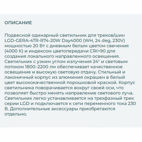 Светильник LGD-GERA-4TR-R74-20W Day4000 (WH, 24 deg, 230V)