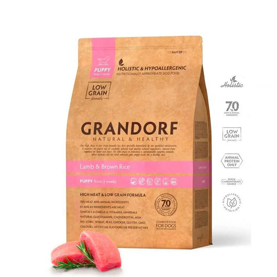 Гипоаллергенный низкозерновой сухой корм Grandorf для щенков от 3 недель, беременных и кормящих собак всех пород Ягнёнок с бурым рисом, (1 кг)