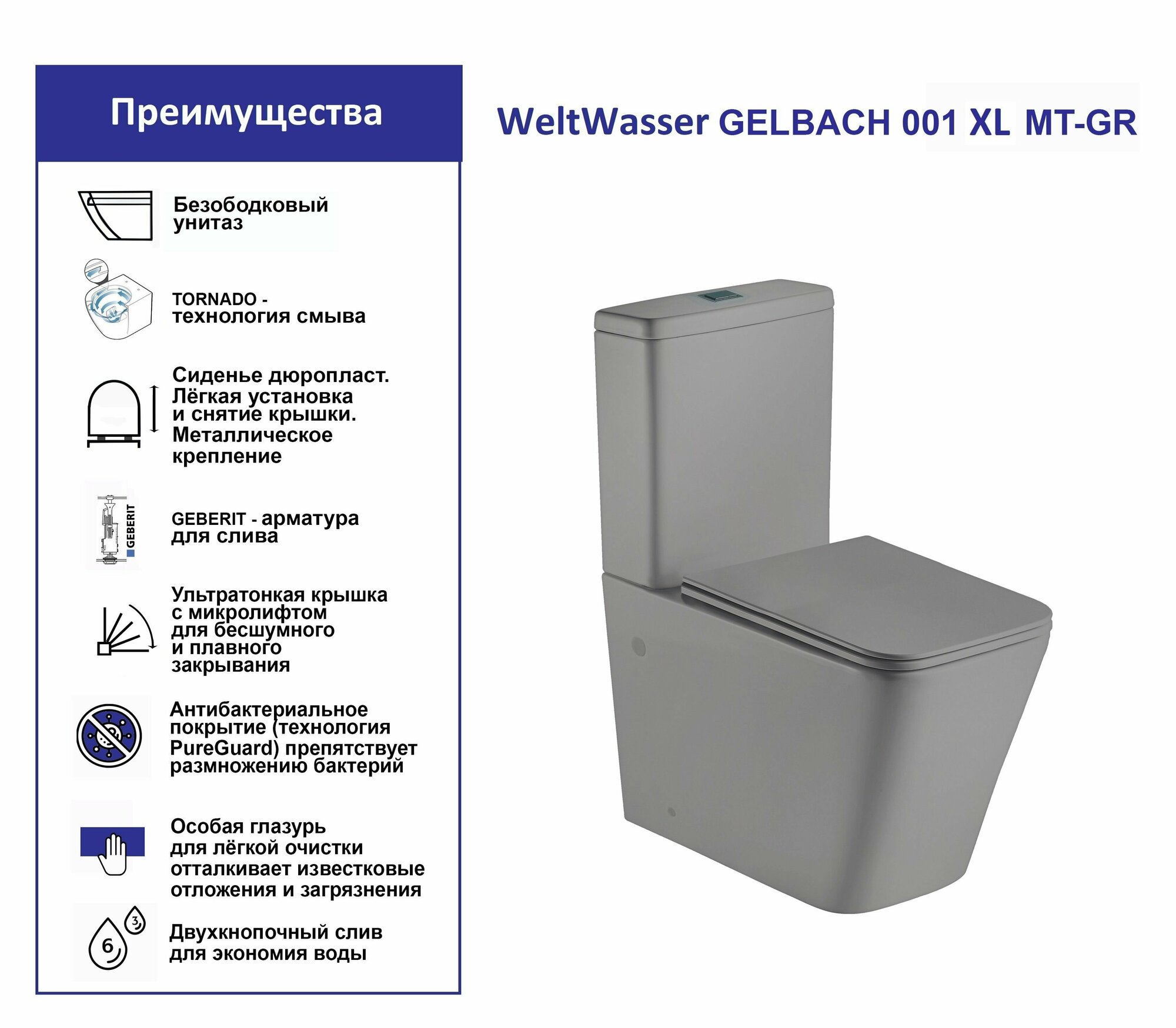 Унитаз компакт WeltWasser WW GELBACH XL 001 MT-GR серый матовый