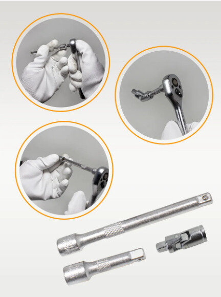 | Ручной инструмент подробно | 1/4": Бит-адаптер для головок 1/4", Удлинитель 50мм, Удлинитель 100мм, Удлинитель гибкий: 150мм, Вороток Т-образный 115мм, Кардан (шарнир карданный), Трещотка 45 зубов маслобензостойкая рукоятка, Рукоятка отверточная (вороток-отвертка) удлинитель 150мм. |