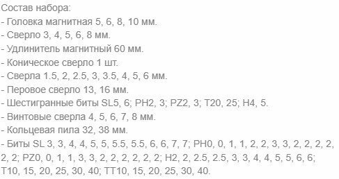 | Оснастка в комплекте | биты / биты с головками / коронки / свёрла |