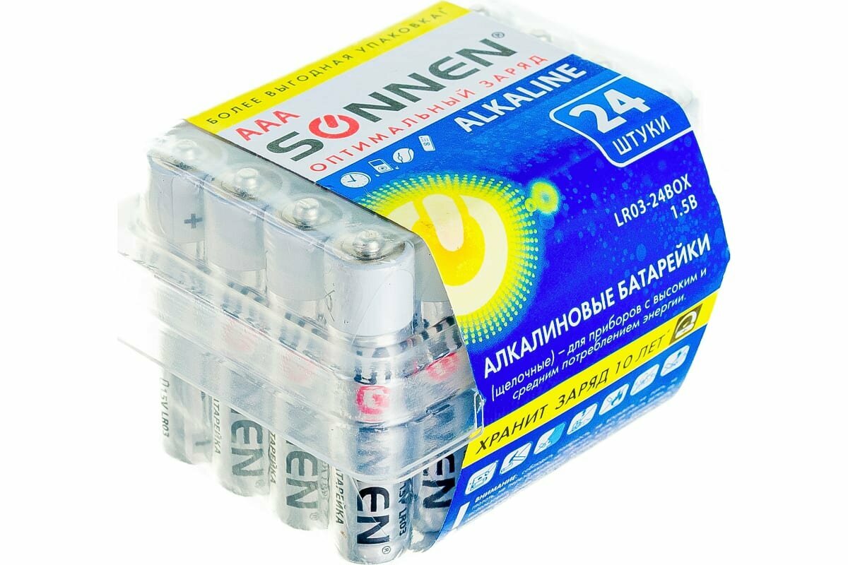 Купить Батарейки комплект 24 шт, SONNEN Alkaline, ААА (LR03, 24А), алкалиновые, мизинчиковые, короб, 455096 В наборе: 1компл.
