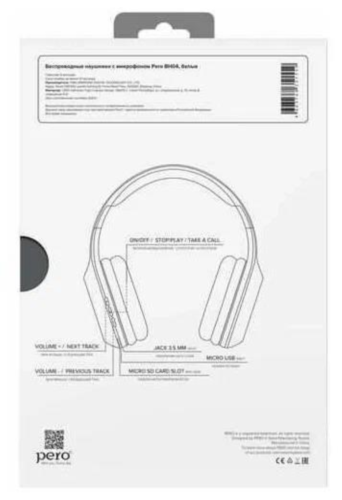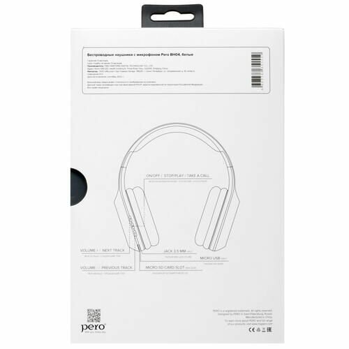 Наушники Pero Bh04, беспроводные, полноразмерные, микрофон, 400 мАч, до 20 часов, белые Pero 9568438 .