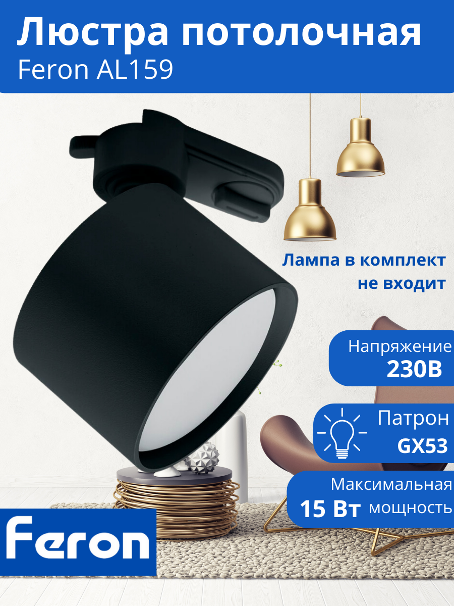 Светильник Feron AL159 трековый однофазный на шинопровод под лампу GX53, черный FERON 41367 (1 шт.)