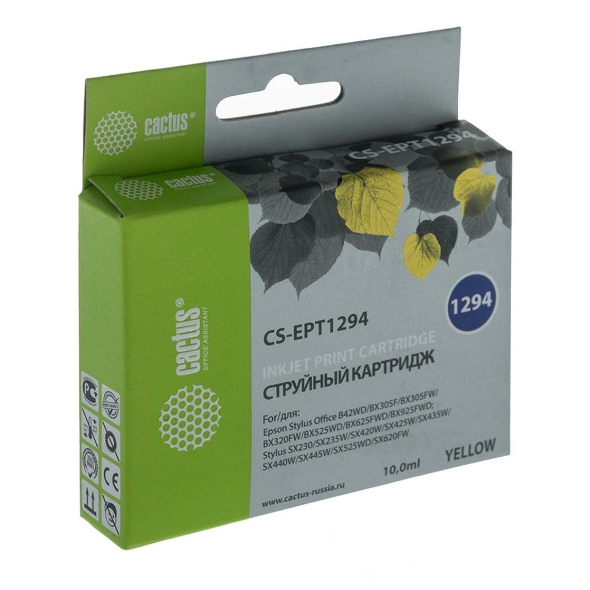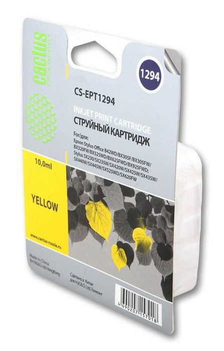 Картридж Cactus CS-EPT1294 для Epson Stylus Office B42/BX305/BX305F/BX320/BX525/BX625/SX420/SX425/SX525/SX620, желтый, 10мл