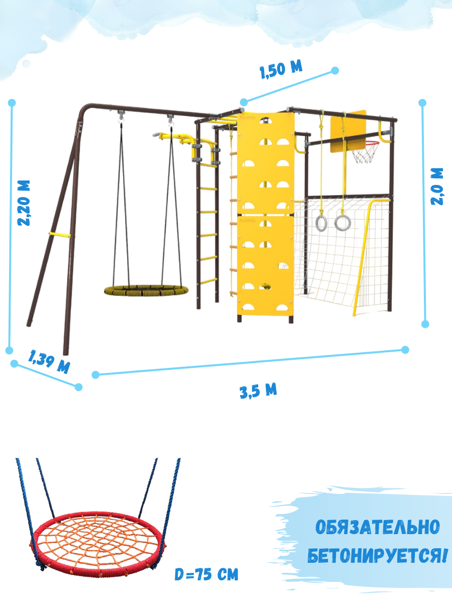 | Комплектация | рукоход, турник, ворота, качели со спинкой на цепях и подшипниках, скалодром, кольцо баскетбольное, кольца гимнастические, канат, лестница веревочная, трапеция, закладные для бетонирования |
