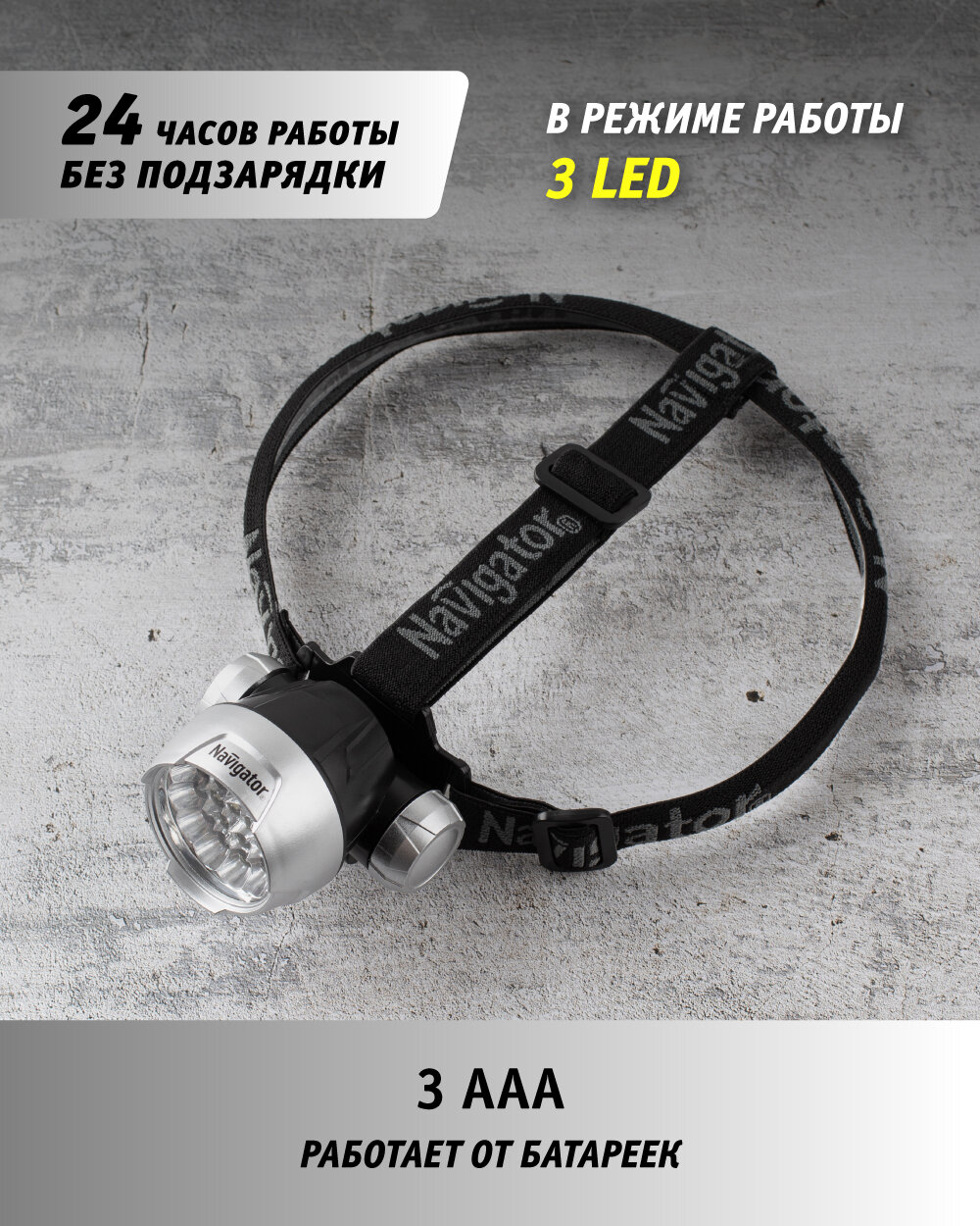 Фонарь налобный Navigator 94 946 NPT-H01, работает от батареек 3ААА