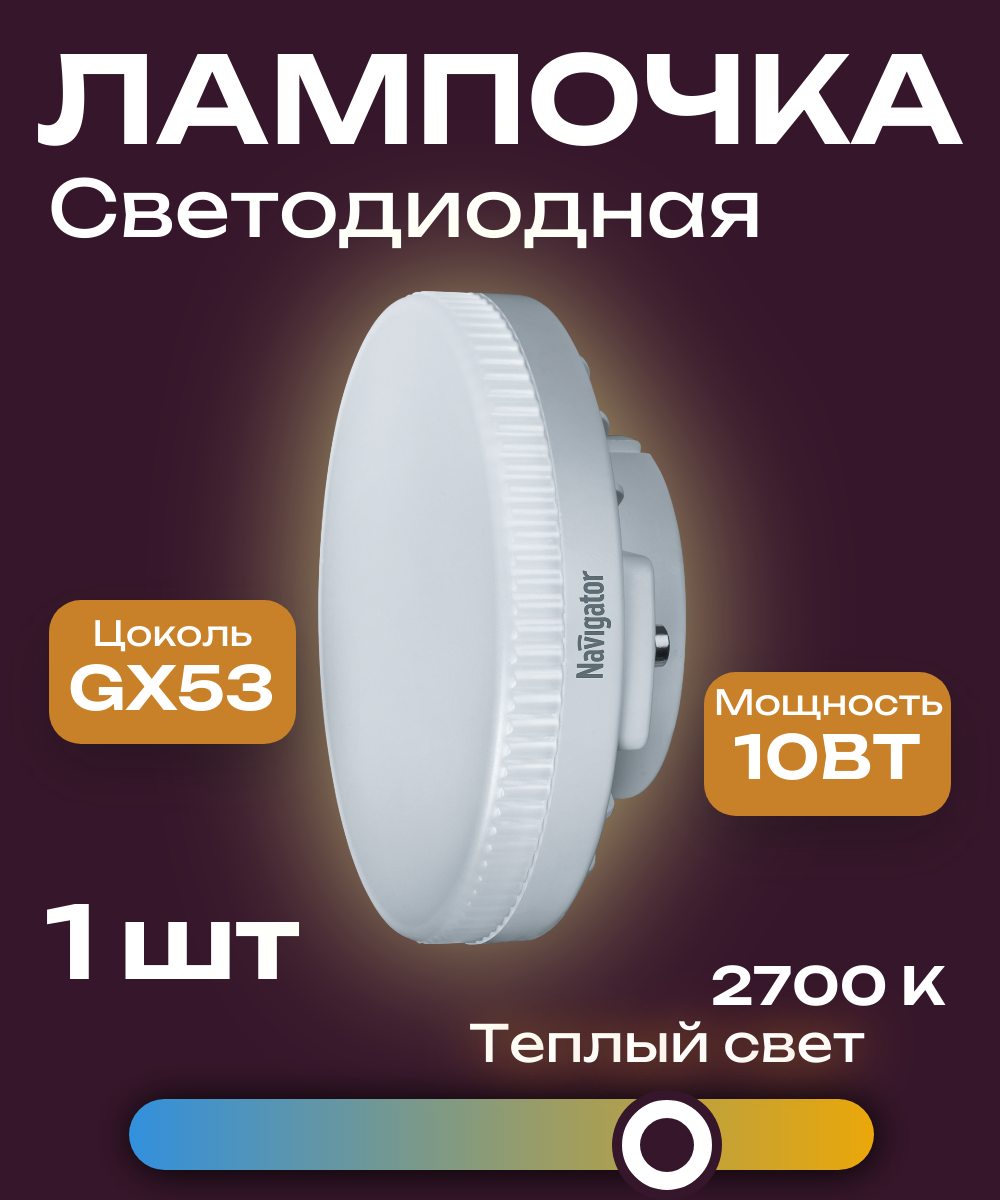 Лампа светодиодная GX53 Navigator Таблетка, 10Вт, 2700К, лампочка 1 шт. 61016