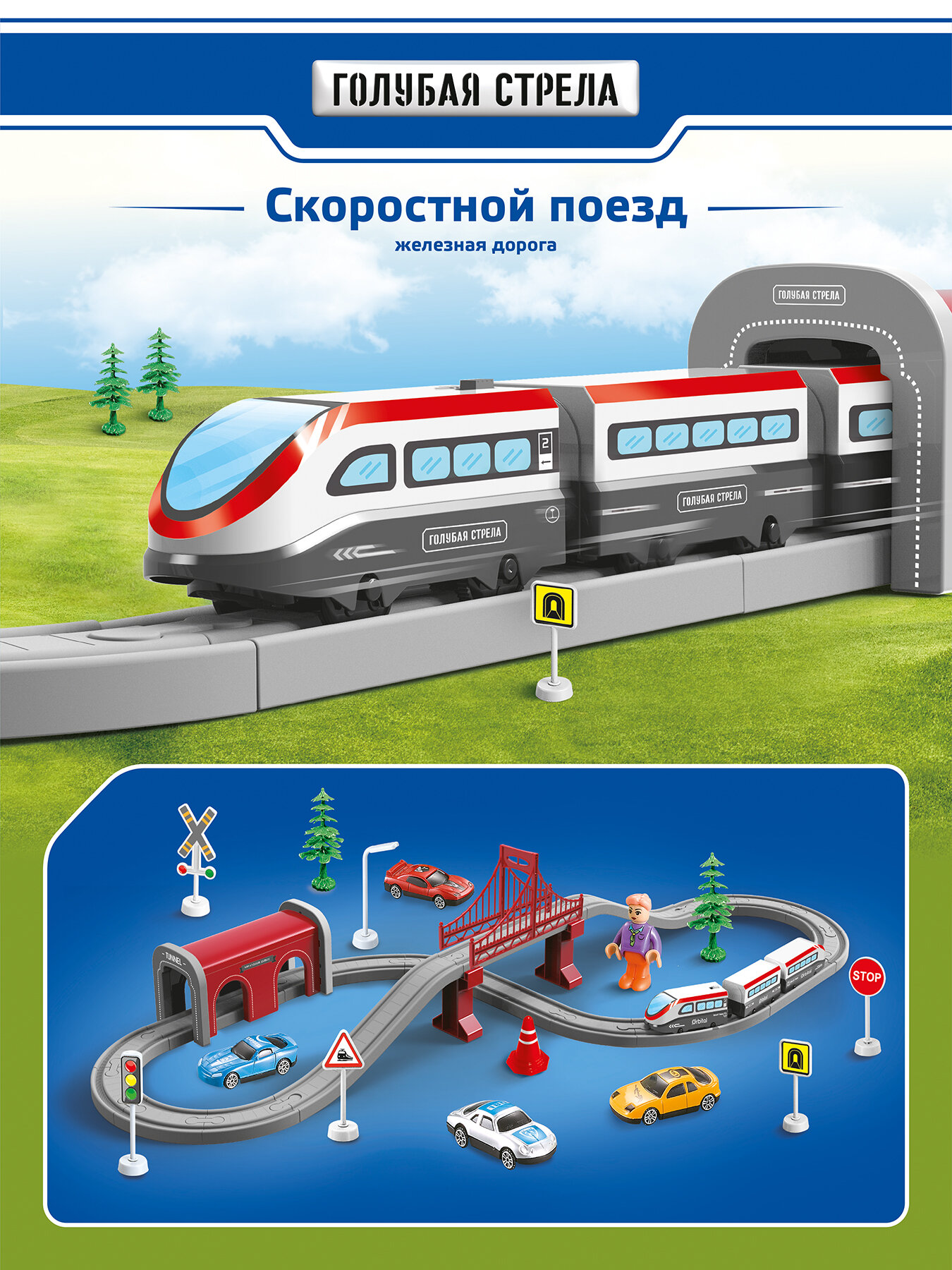 Железная дорога Голубая Стрела "Скоростной Поезд", с мостиком и тоннелем