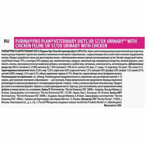 Купить PRO PLAN VETERINARY DIETS UR ST/OX URINARY CHICKEN для взросл кошек при мочекаменной болезни с куриц 0,35 кг