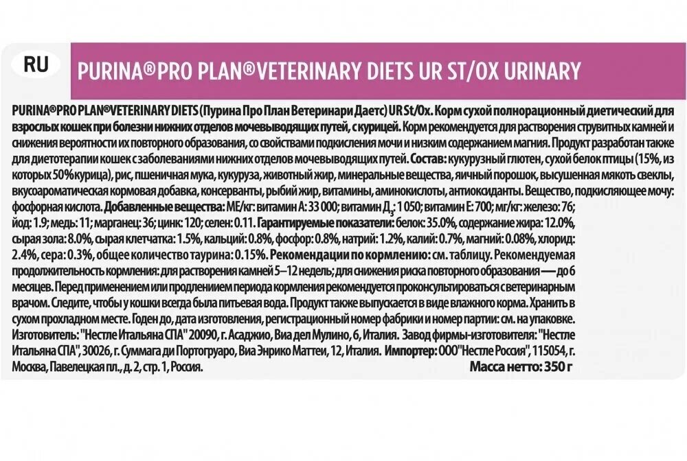 СохранитьPRO PLAN VETERINARY DIETS UR ST/OX URINARY CHICKEN для взросл кошек при мочекаменной болезни с куриц 0,35 кг интересное: