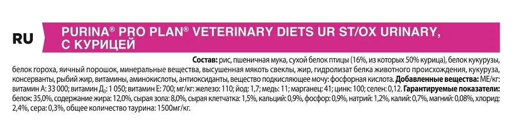 Корм для кошек PRO PLAN Veterinary Diets UR St/Ox при болезни нижних отделов мочевыводящих путей, курица сух. 1,5 кг