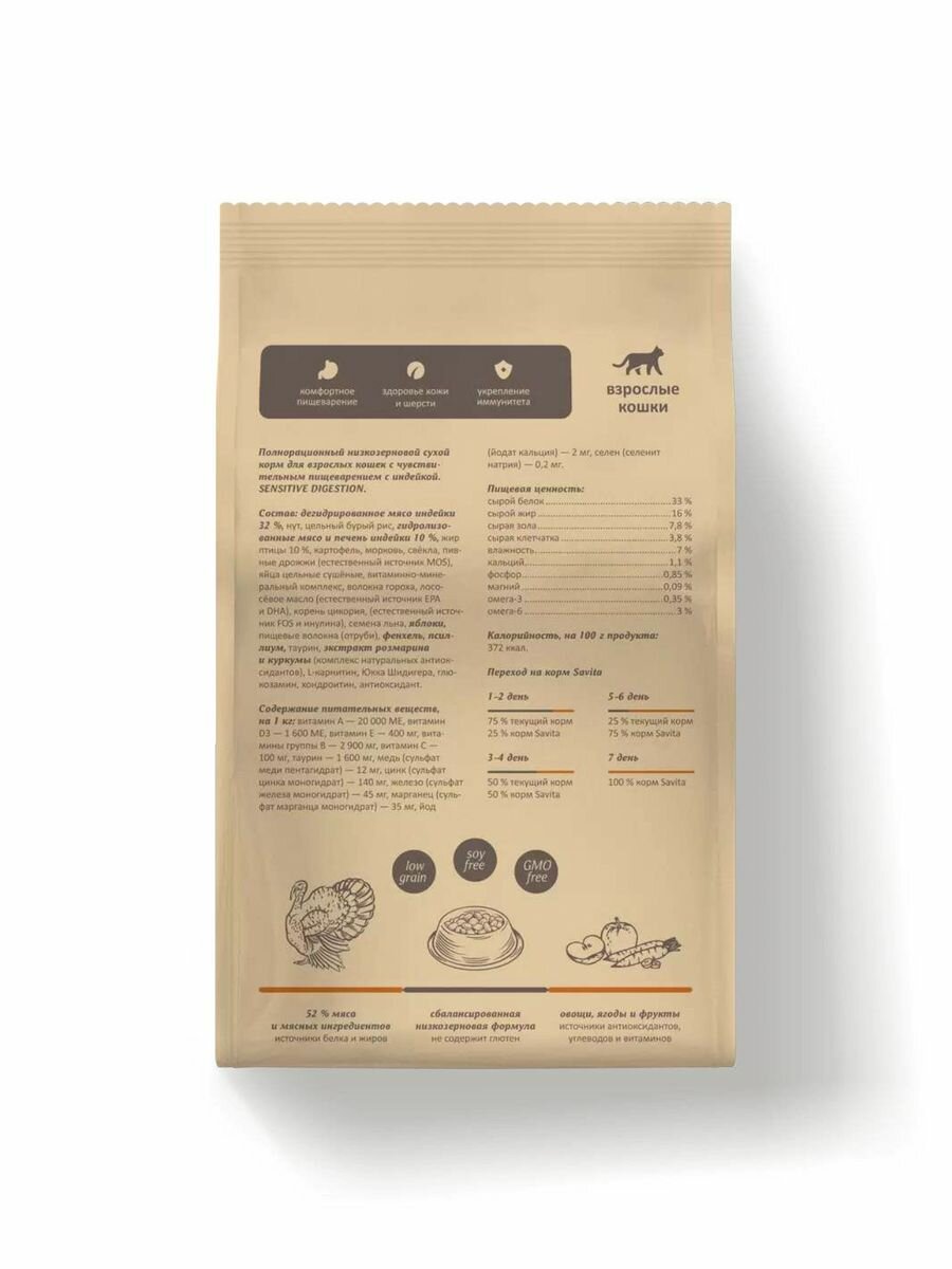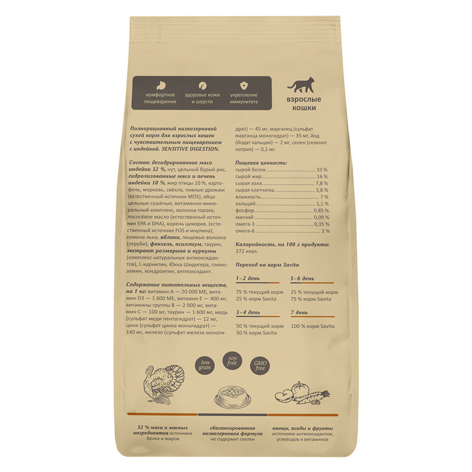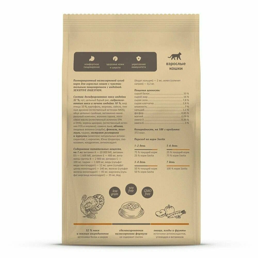 SAVITA сухой корм Для кошек с чувствительным пищеварением с индейкой и бурым рисом. SENSITIVE DIGESTION 0,600 кг 62579 (1 шт)
