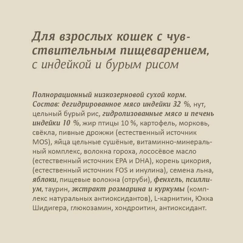 | Состав | мясо (в т.ч. индейка 30 %, кролик 8 %), картофель, зелёный горошек, жир индейки, витаминно-минеральный комплекс, пивные дрожжи ,цельное яйцо, пульпа сахарной свёклы, льняное семя, тыква, морковь , лососёвый жир,брусника, L-карнитин, ромашка, розмарин, цикорий, таурин, глюкозамин из животных тканей, сульфат хондроитина, юкка Шидигера |