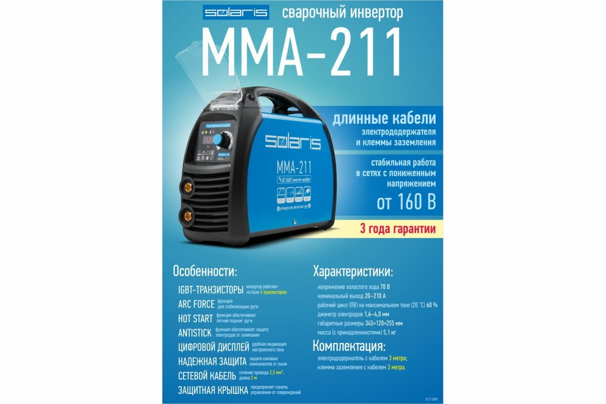 Купить Solaris Инвертор сварочный MMA-211 (230В, 20-210 А, 70В, электроды диам. 1.6-4.0 мм, вес 3.9 кг)