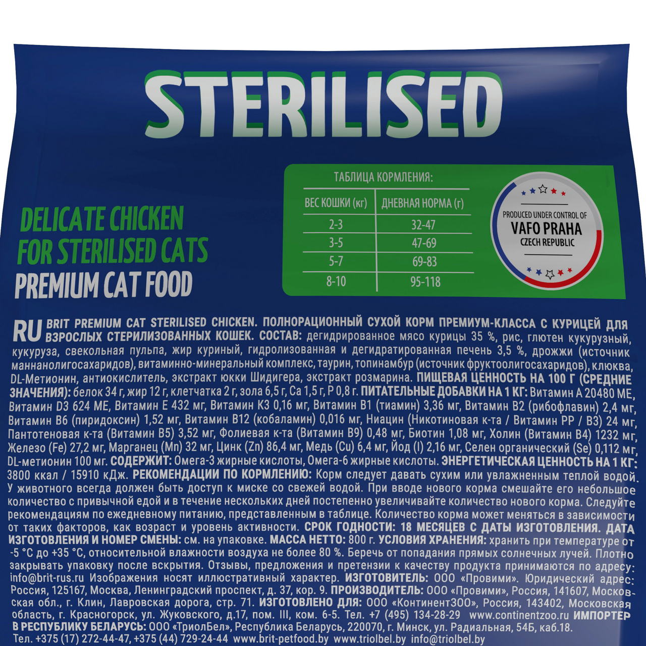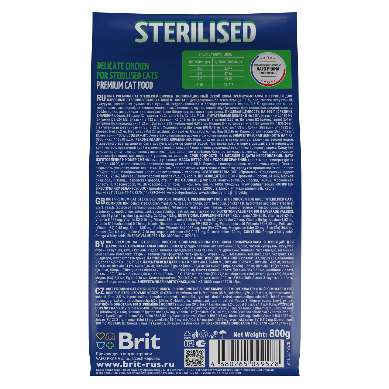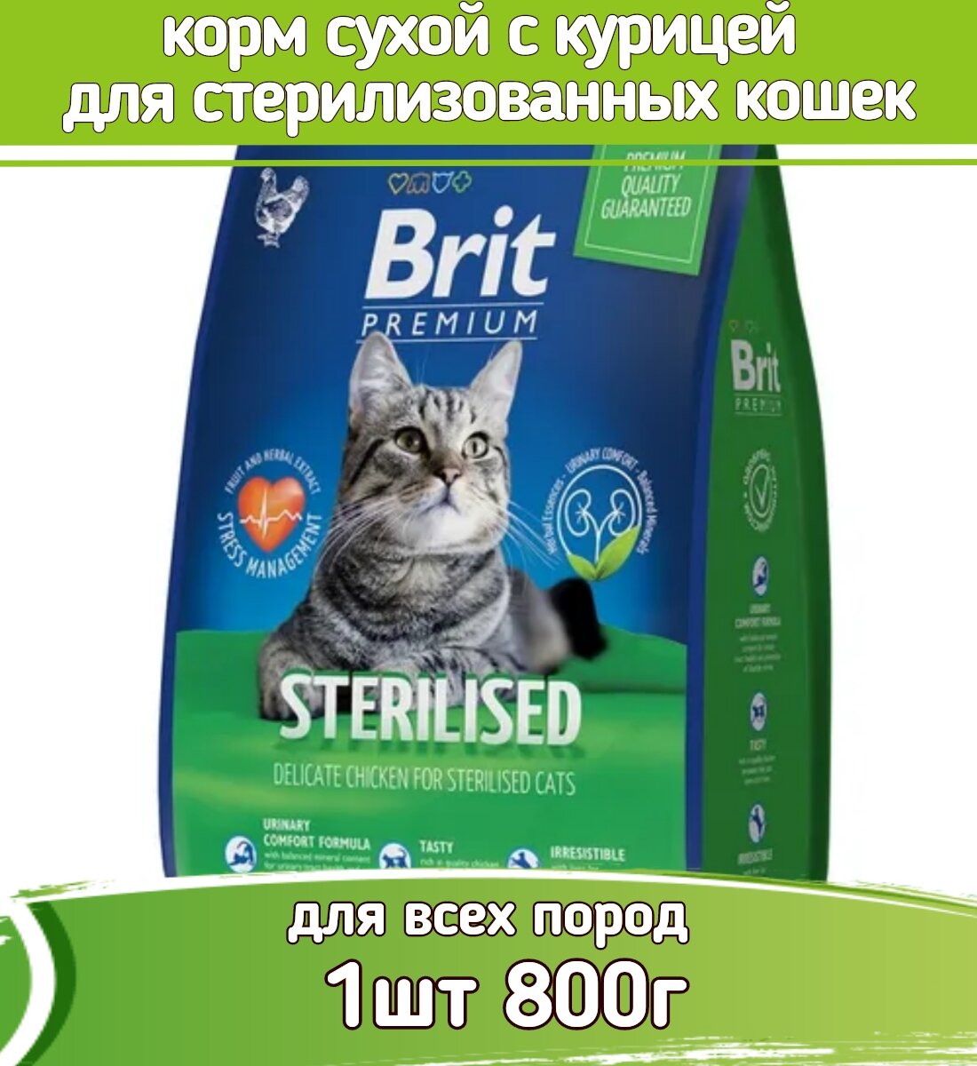 Корм BRIT 800гр для стерилизованных кошек с курицей Premium Cat Sterilized