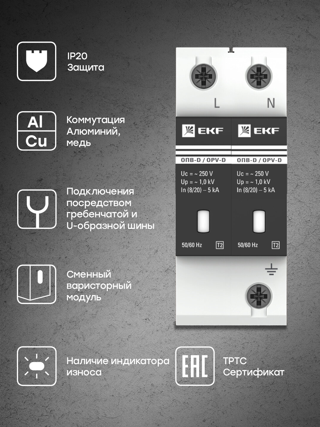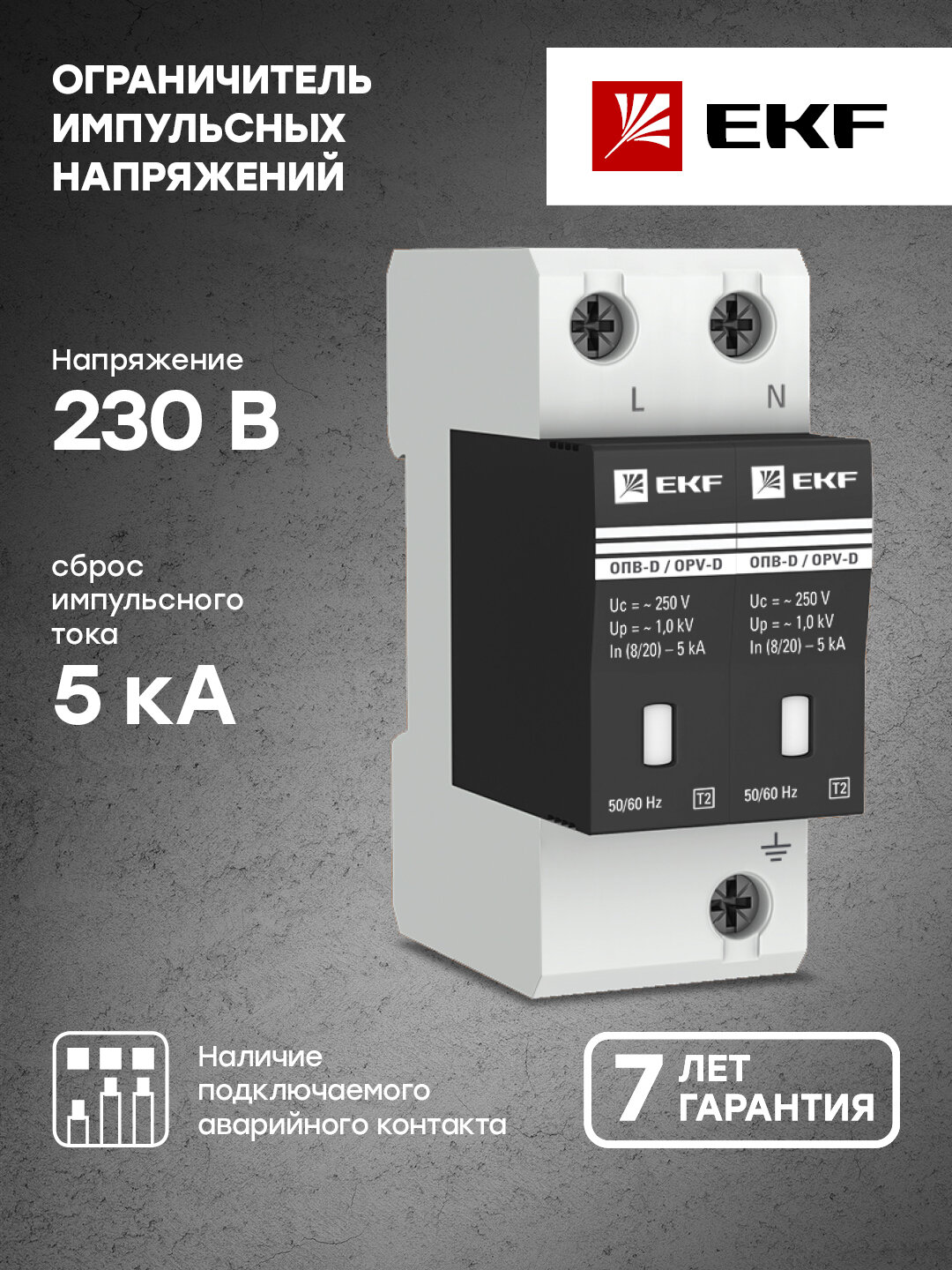 EKF Ограничитель импульсных напряжений серии ОПВ-D/2P In 5кА 230В EKF opv-d2