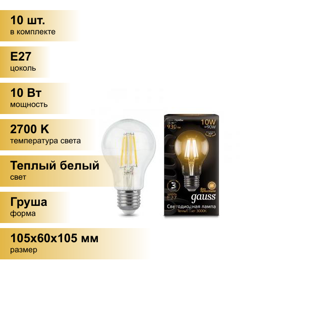(10 шт.) Светодиодная лампочка Gauss Filament ЛОН A60 E27 10W(930lm) 2700K 2K прозр. 105x60 филамент (нитевидная), 102802110