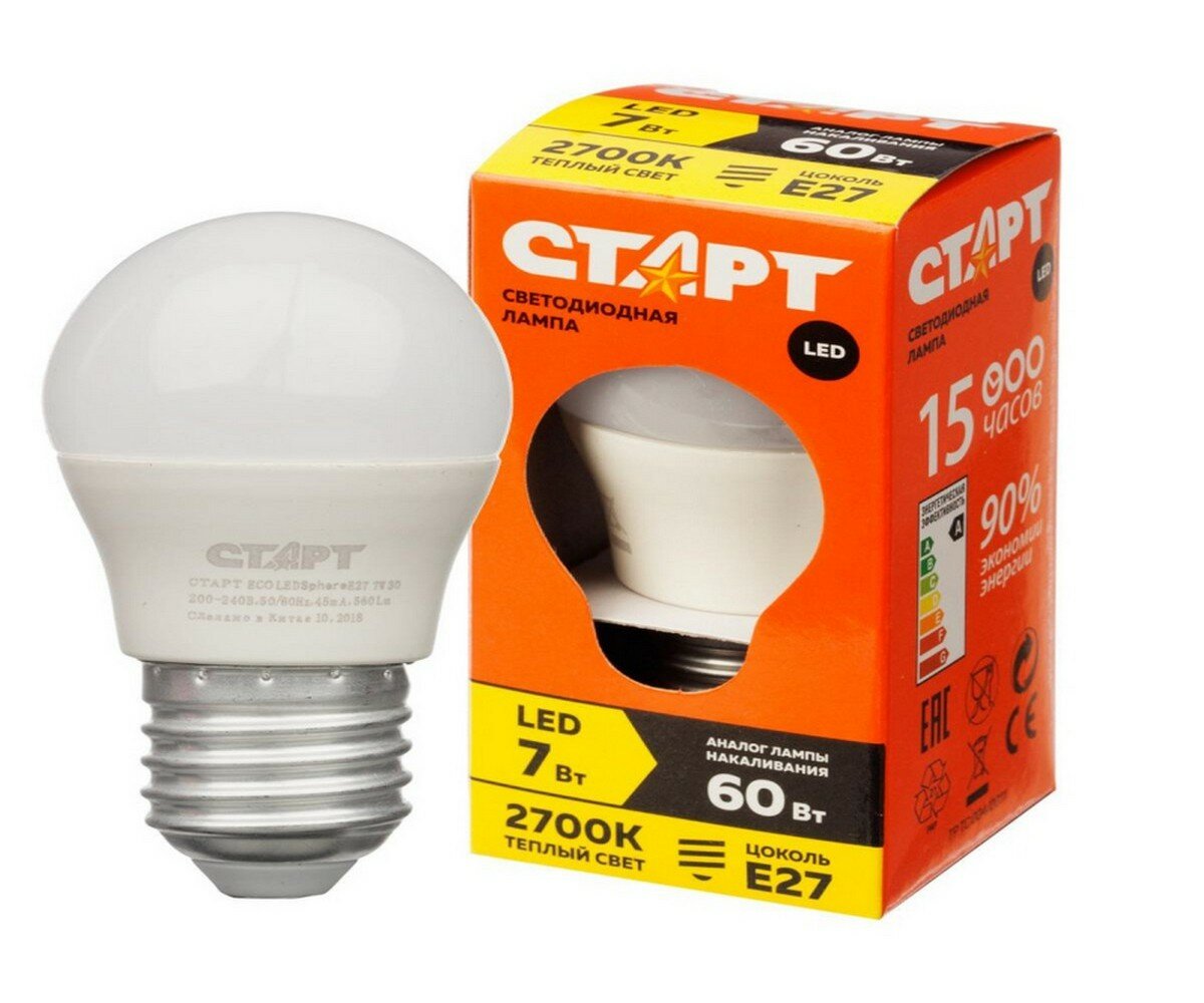 Лампа Старт "Eco", светодиодная, 7W, E27, 2700К, теплая белая, шар интересное: