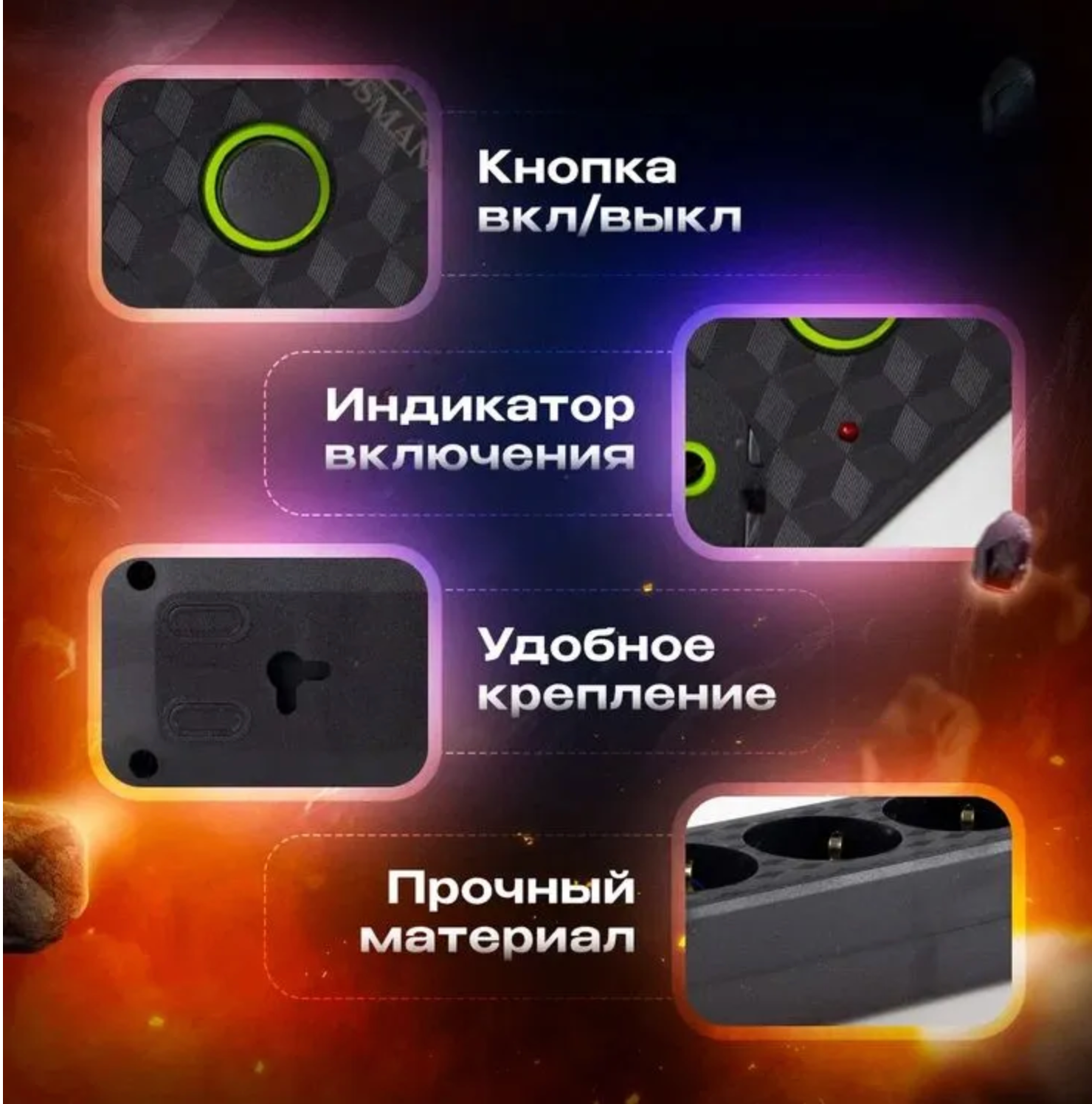 | Плюсы: | удобный, 5 розеток, возможность отключения каждой розетки в отдельности |