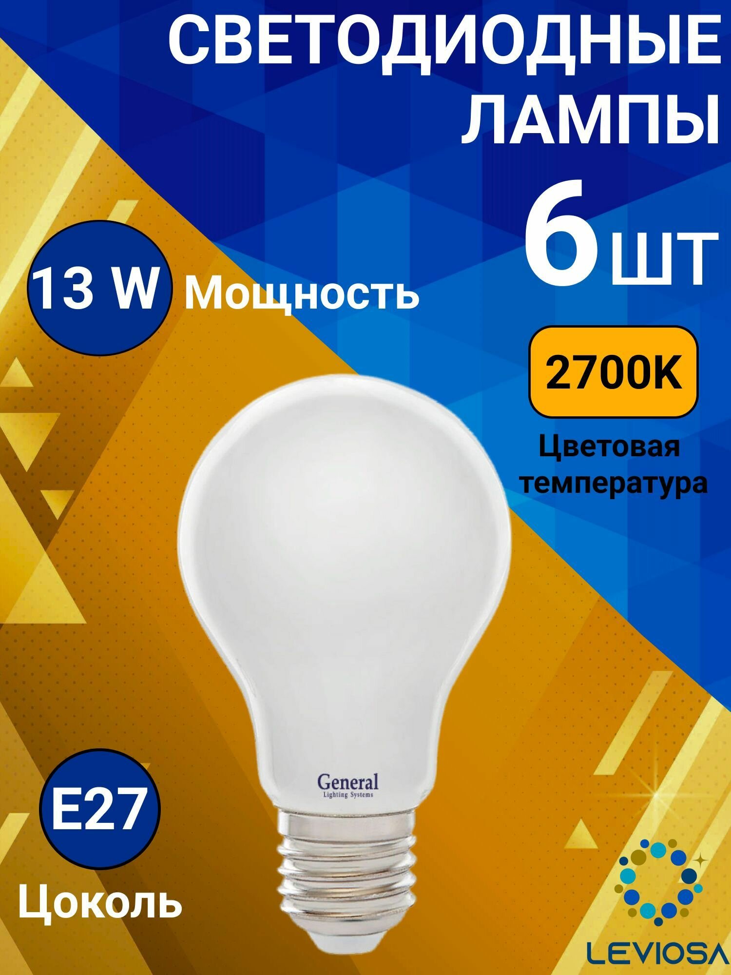 Лампочка светодиодная филаментная, General, Комплект из 6 шт., 13 Вт, Цоколь E27, 2700К, Форма лампы Груша, A60S