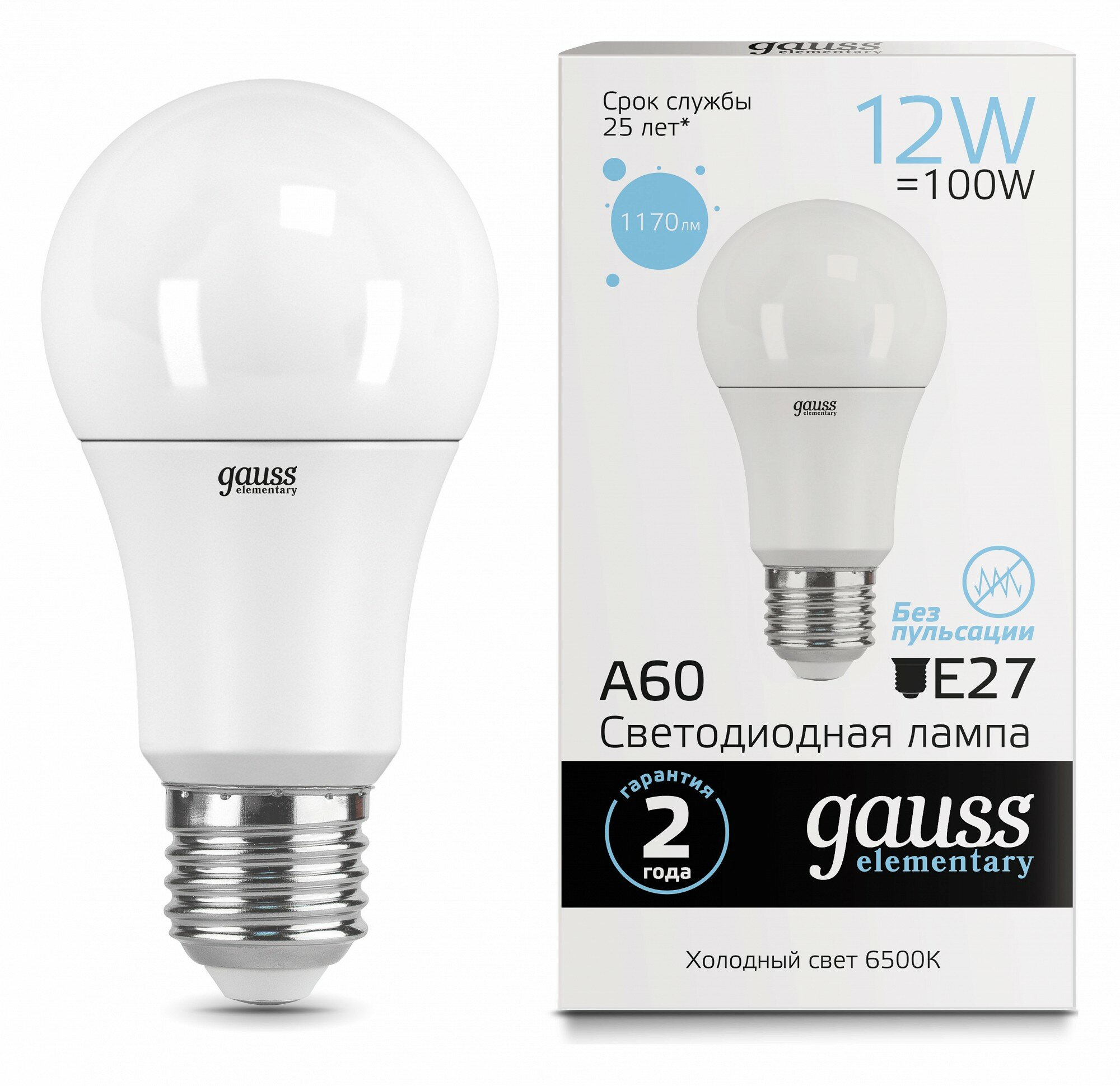 (2 шт)Лампа Gauss Elementary A60 12W 1170lm 6500K E27 LED 1/10/50