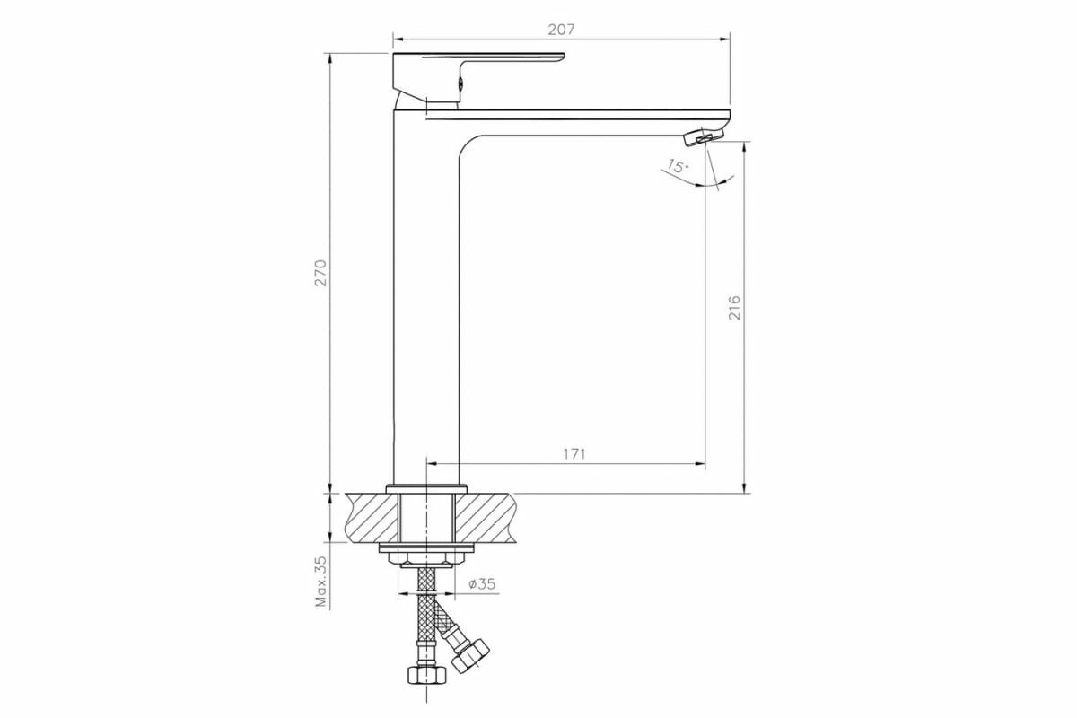 | Комплектация | Смеситель; Керамический катридж 35мм; Аэратор; Металлическая рукоятка; Паспорт изделия; Гибкая подводка 40см 1/2 |