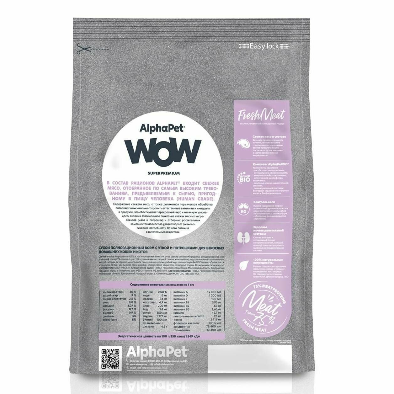 AlphaPet WOW Сухой полнорационный корм Superpremium с уткой и потрошками, для взрослых домашних кошек и котов, 1,5 кг
