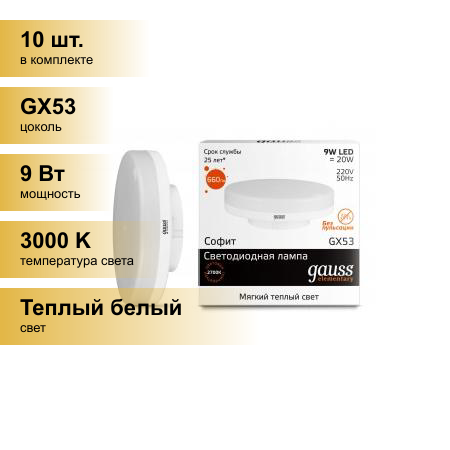 Упаковка светодиодных ламп 10 шт. gauss 83819, GX53, 9Вт, 3000 К