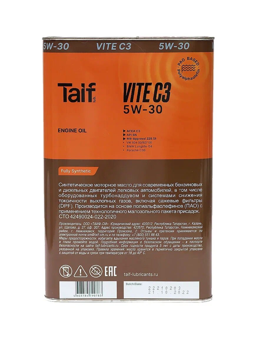 Моторное масло TAIF VITE 5W-30 Синтетическое ПАО, С3, 4 л