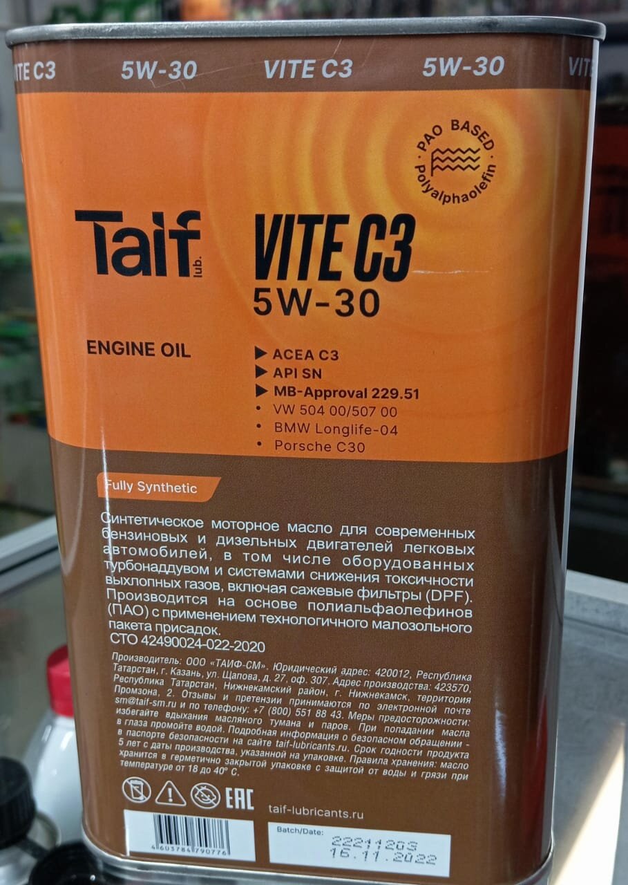 СохранитьTAIF 211013 TAIF Масо моторное VITE 5W-30, 1L ACEA C3, MB-229.51, VW 504 00/507 00, Porsche C30, BMW LL-04 интересное: