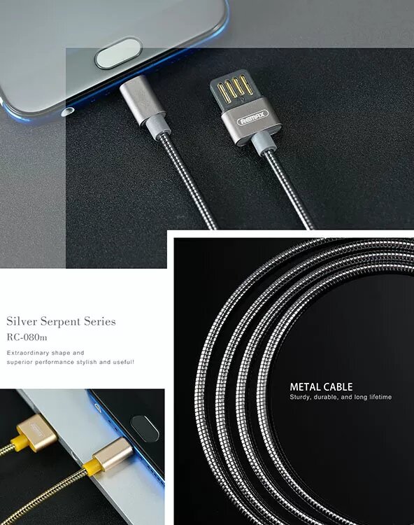 Кабель USB - микро USB Remax RC-080m Silver Serpent, 1.0м, круглый, 2.1A, металл, цвет: серебряный