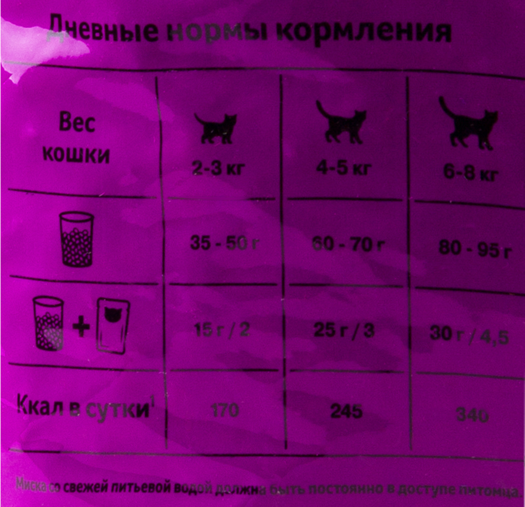 | Состав | Злаки и продукты их переработки, мука животного происхождения (в том числе из лосося), растительные белковые экстракты, животные жиры и растительные масла (в том числе подсолнечное масло), гидролизат из продуктов животного происхождения, минеральные вещества, витамины, свекловичный жом, пивные дрожжи, аминокислоты (в том числе таурин), красители, морковь сушеная, антиоксиданты. |
