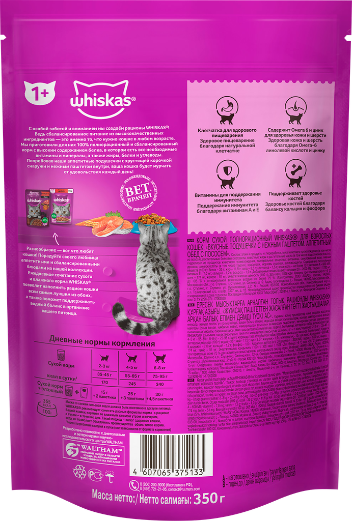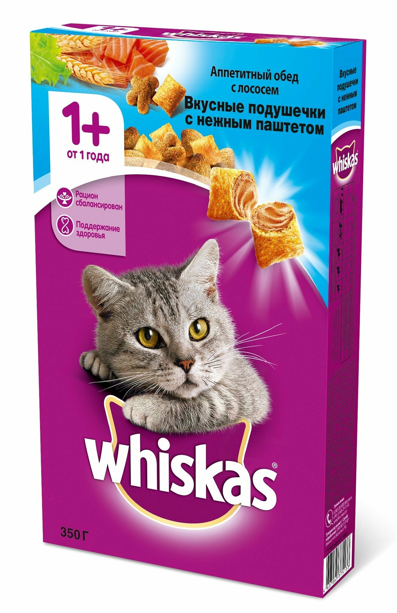 Корм сухой Whiskas полнорационный для взрослых кошек «Вкусные подушечки с нежным паштетом. Аппетитный обед с лососем», 350г