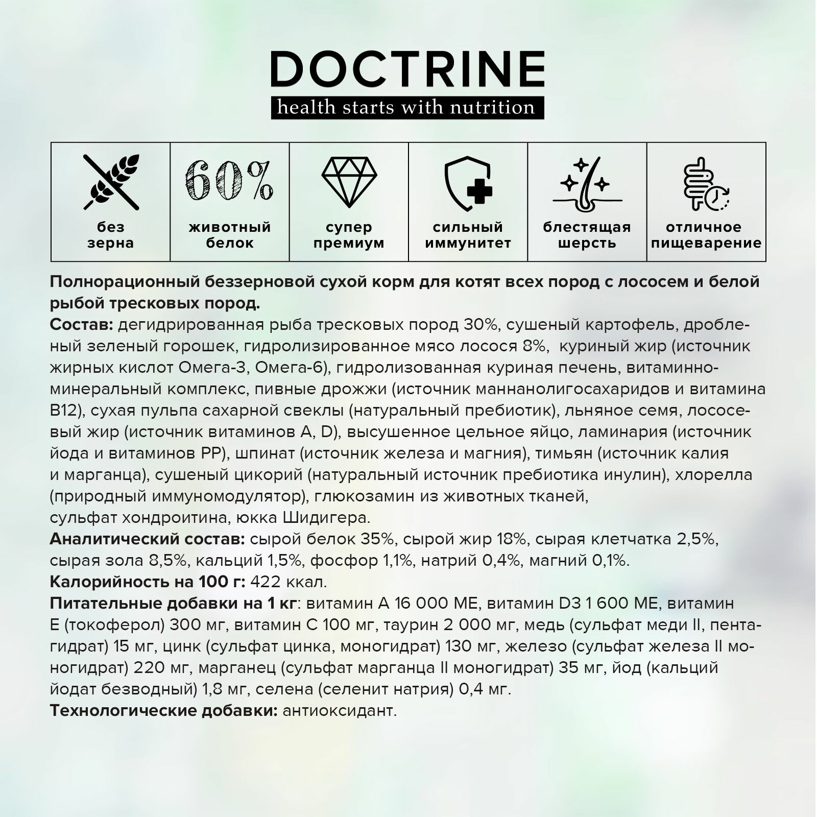 Сухой корм для котят Беззерновой DOCTRINE с лососем и белой рыбой 10кг / доктрин, доктрина