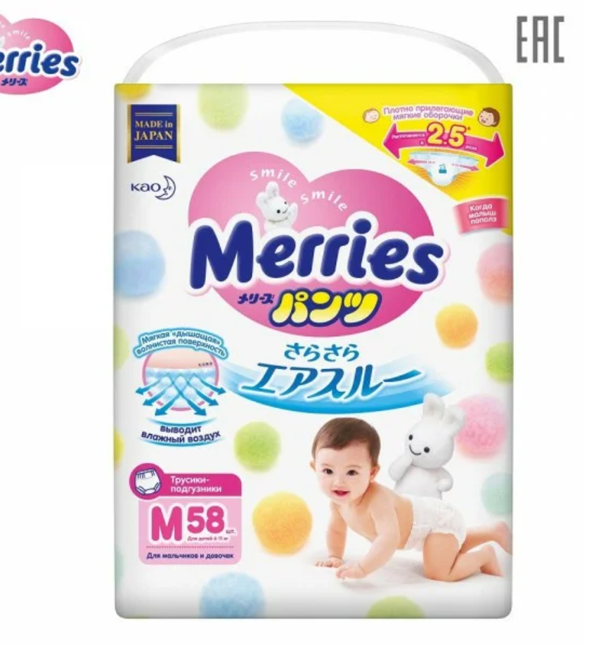 Трусики-подгузники Merries для детей размер M / 3 (6-11 кг), 58 шт, дышащие