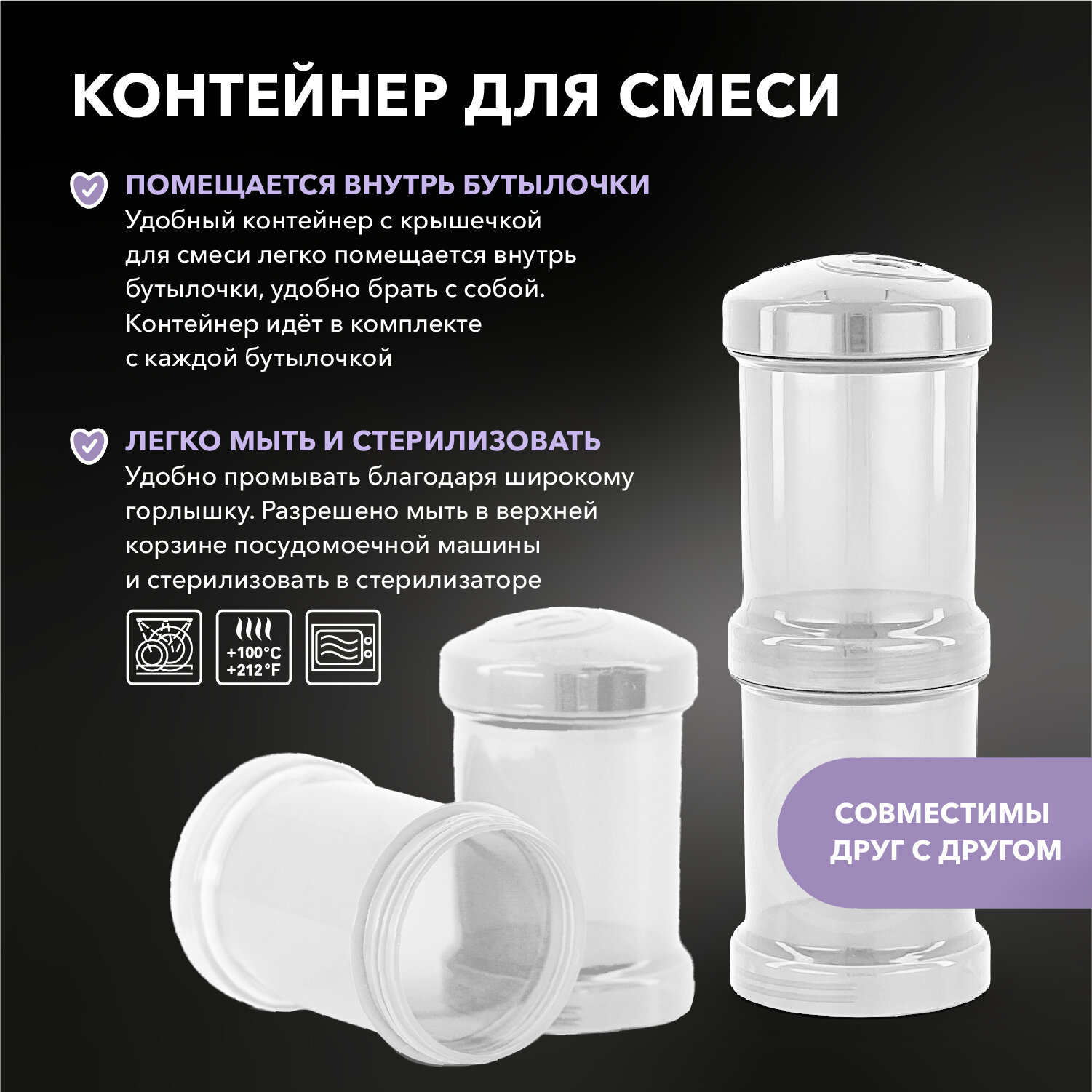 | Комплектация | бутылочка объемом 260 мл с соской, контейнер для хранения сухой смеси объемом 100 мл |